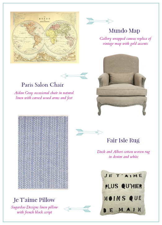 1. Mundo Map (available in store only or call for details) 2. Aidan Gray Paris Salon Chair Gray Linen 3. Dash & Albert Fair Isle Rug French Blue 4. Sugarboo Designs Je T'aime Pillow