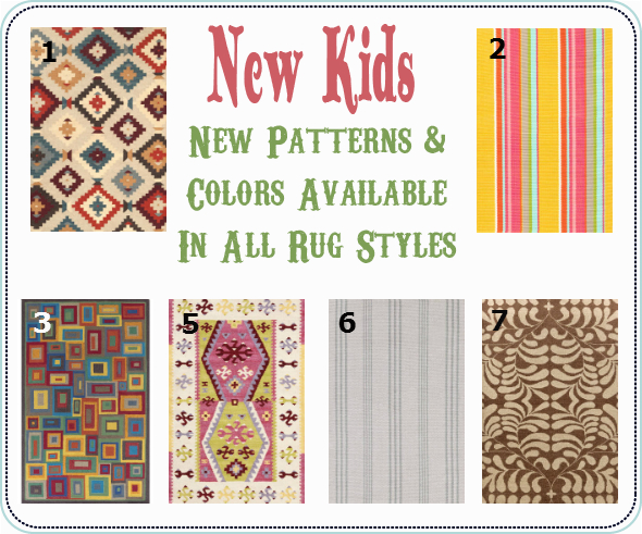 1. Zipper Red Wool Woven Rug 2. Vine Blue/Green Tufted Wool Rug 3. Scroll Chocolate Wool Hooked Rug 4. Seashells Cotton Hooked Rug 5. Catamaran Stripe Slate/Ivory Rug 6. Aquinnah Cotton Woven Rug
