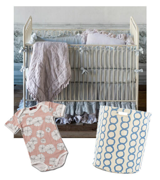 If you’re expecting the arrival of a family member this year, you couldn’t have timed it better--these are classic colors for your little one’s clothing and nursery decor. The crib’s bedding is from Bella Notte Linens, constructed in the U.S. and made with low impact dyes and environmentally friendly fibers. Heirloom Rose and Cloud are the perfect pantone color matches. Add this Canvas Storage Hamper for tossing tiny bibs and socks. And before you put them down for a nap, change them in this MilkBarn Onesie (also available in this blue).