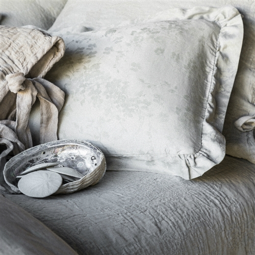 Create a sense of femininity and romance in your bedroom with a delicately floral Bella Notte Lillian Accent Pillow with Ruffles. This lovely decorative piece is made from luxurious lightweight sateen jacquard weave fabric, which creates a subtle two-tone look. The pillow is finished with a simple ruffle and agoya shell button closures, and it is gently dyed in a variety of ethereal colors. It’s a charming addition to any boudoir. Lillian is also available in a duvet cover and pillow shams.