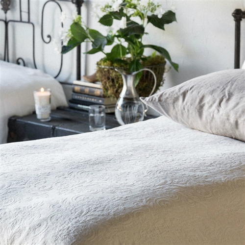 Dress your bed in the softest, most luxurious coverlet ever designed by Bella Notte Linens. The Florence Coverlet with Velvet Trim embodies an old world renaissance charm that is perfect for the shabby chic lover. This cotton/bamboo blend is woven into a feminine scroll damask matelassé that is so luscious and cozy you'll want one for all your bedrooms. It is softness that soothes the soul. Accent this coverlet with The Florence pillow shams.