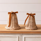 Add playful charm with natural rattan bells accented by soft caramel velvet ribbons, perfect for joyful decorating. Sold as a set of 2.