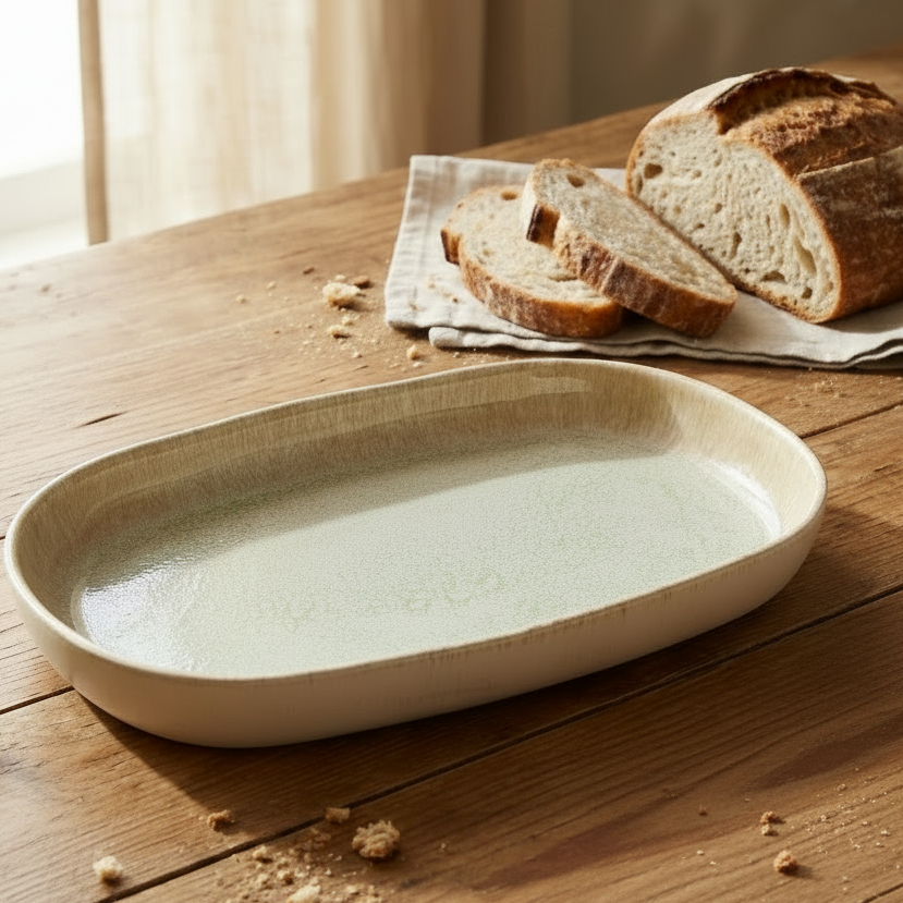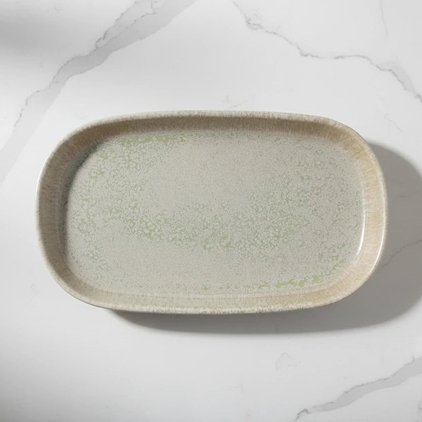 Simple reactive glaze in aqua and cream tones make this platter a beauty for your neutral kitchen. Made from stoneware and substantial, this is one of our favorite pieces this season.