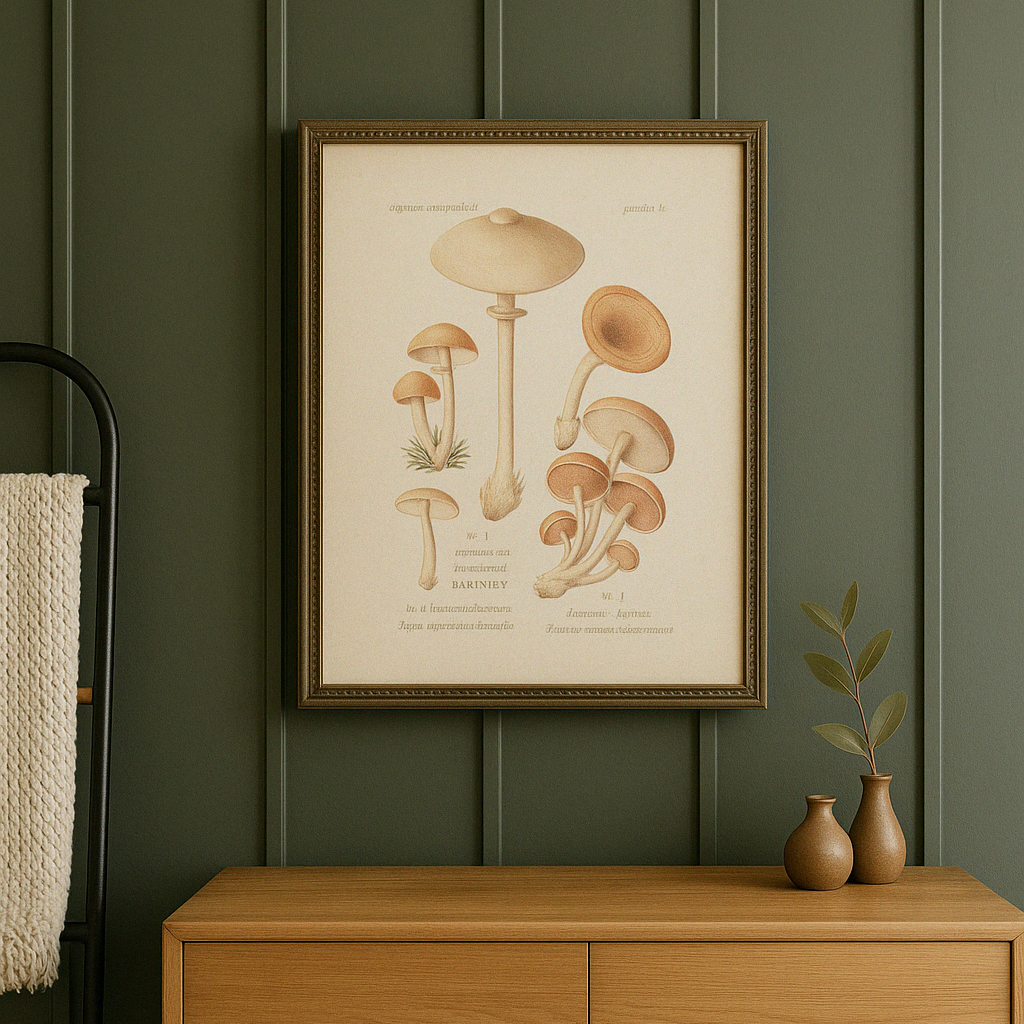 This unique piece features a vintage etymology mushroom botanical print, printed on canvas fabric for a rustic look. Perfect for bringing a touch of nature and nostalgia into any space. Framed in a textured gray with gold frame.