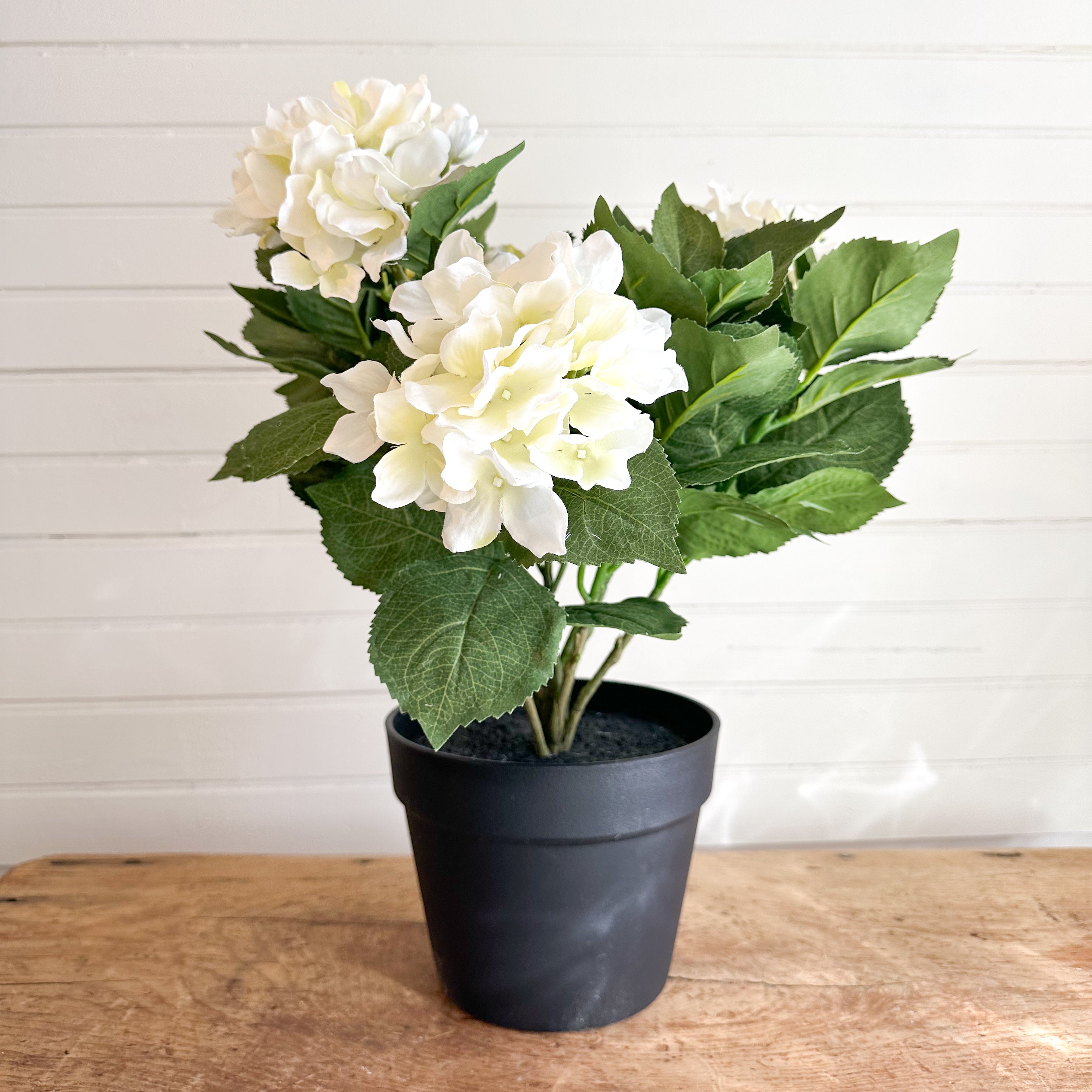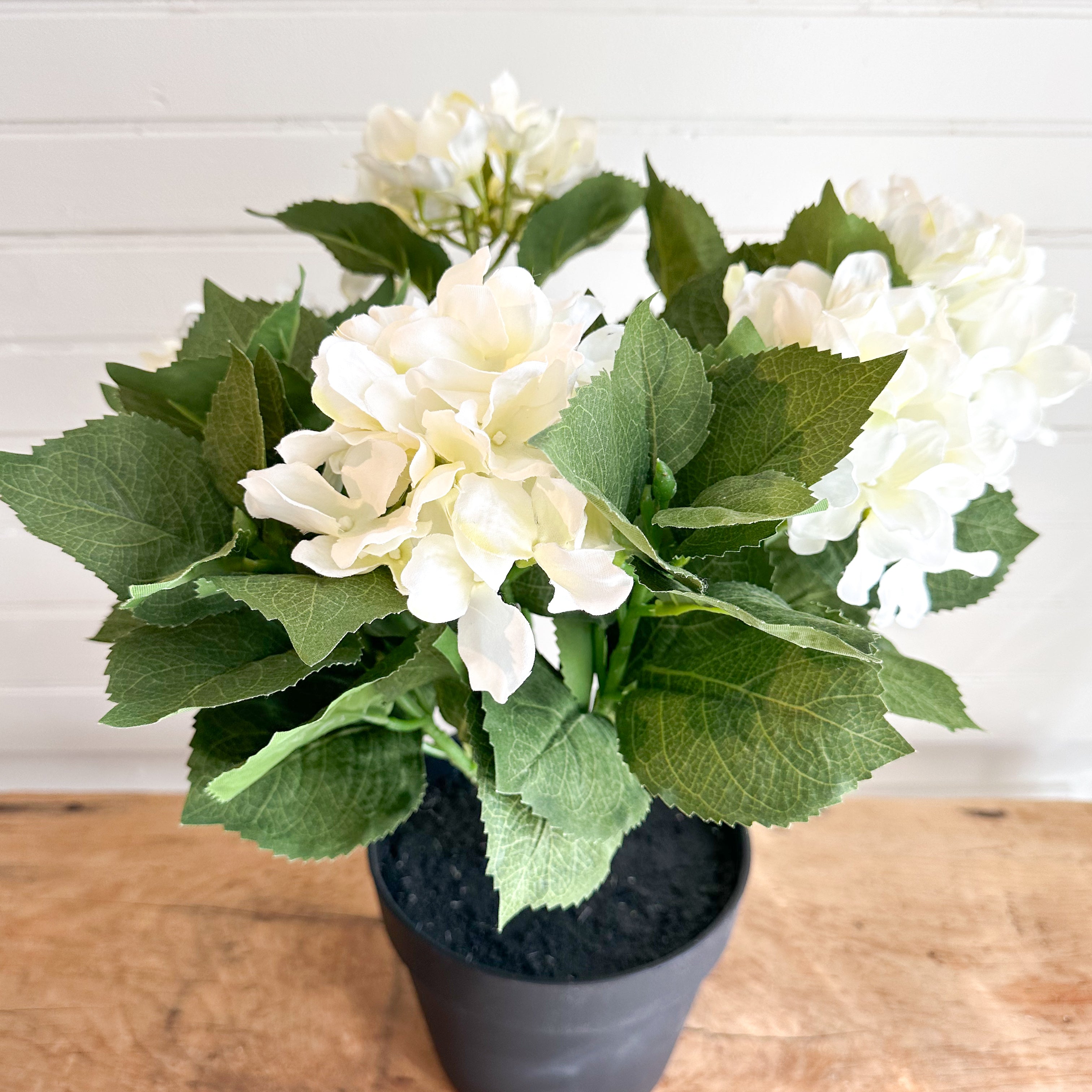 Beautiful, bountiful, and blooming hydrangeas in the creamy white for spring and summer. Each one comes faux potted in a simple black pot than can be dropped into a ceramic pot or planter of choice.