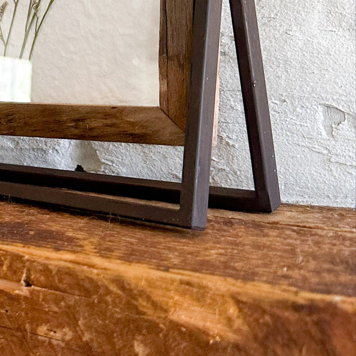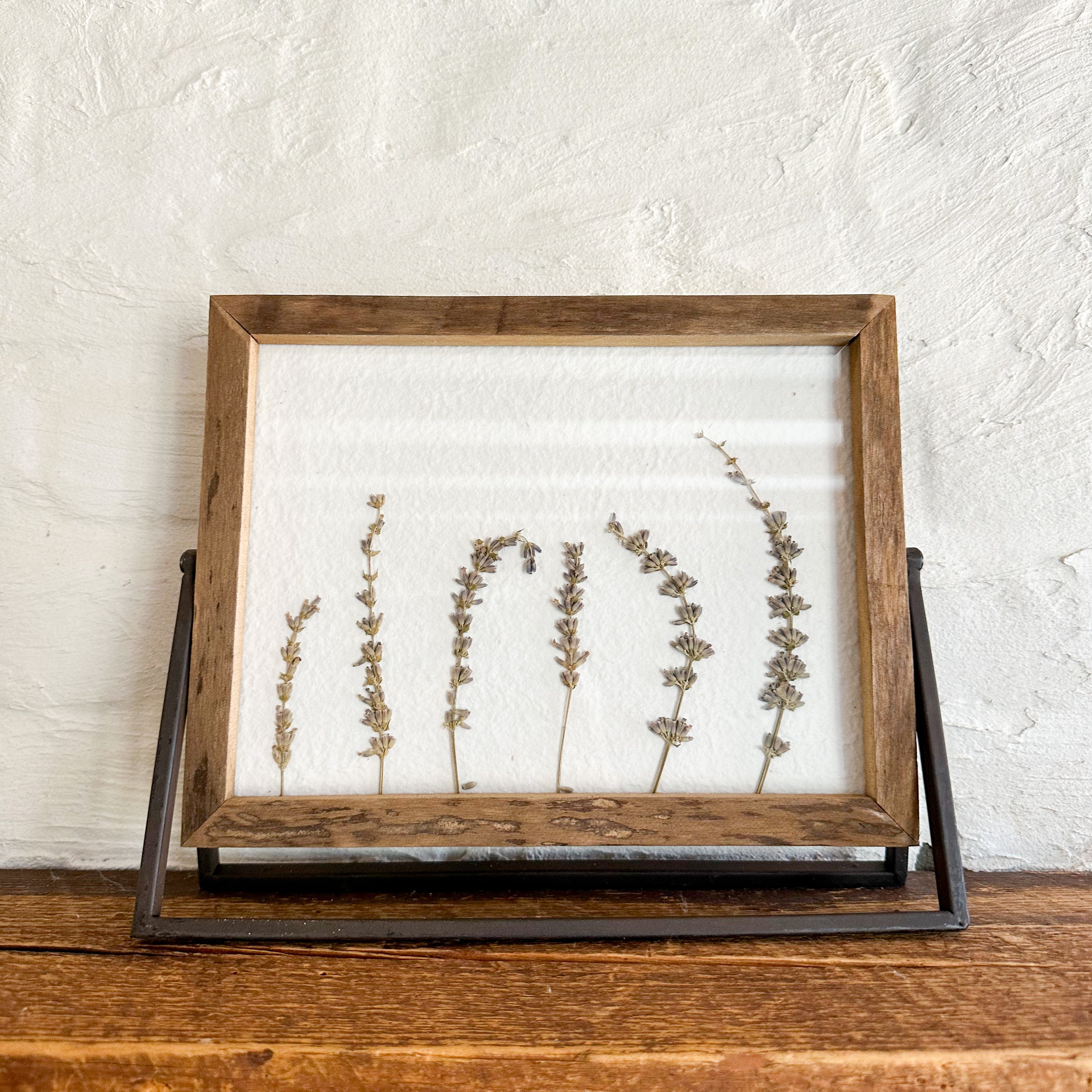 Pressed botanicals are a huge theme for us this spring. This horizontal version has a wood frame and a metal stand to bring in a composition of multiple elements. The dried lavender is pressed simply making this perfect for any spot in your home.