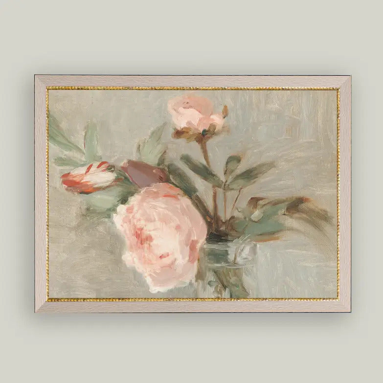 Soft, romantic light pink roses captured in timeless antique-style artwork. This delicate botanical print brings warmth and elegance to any room, framed in a charming white-washed frame with gold beaded detailing.