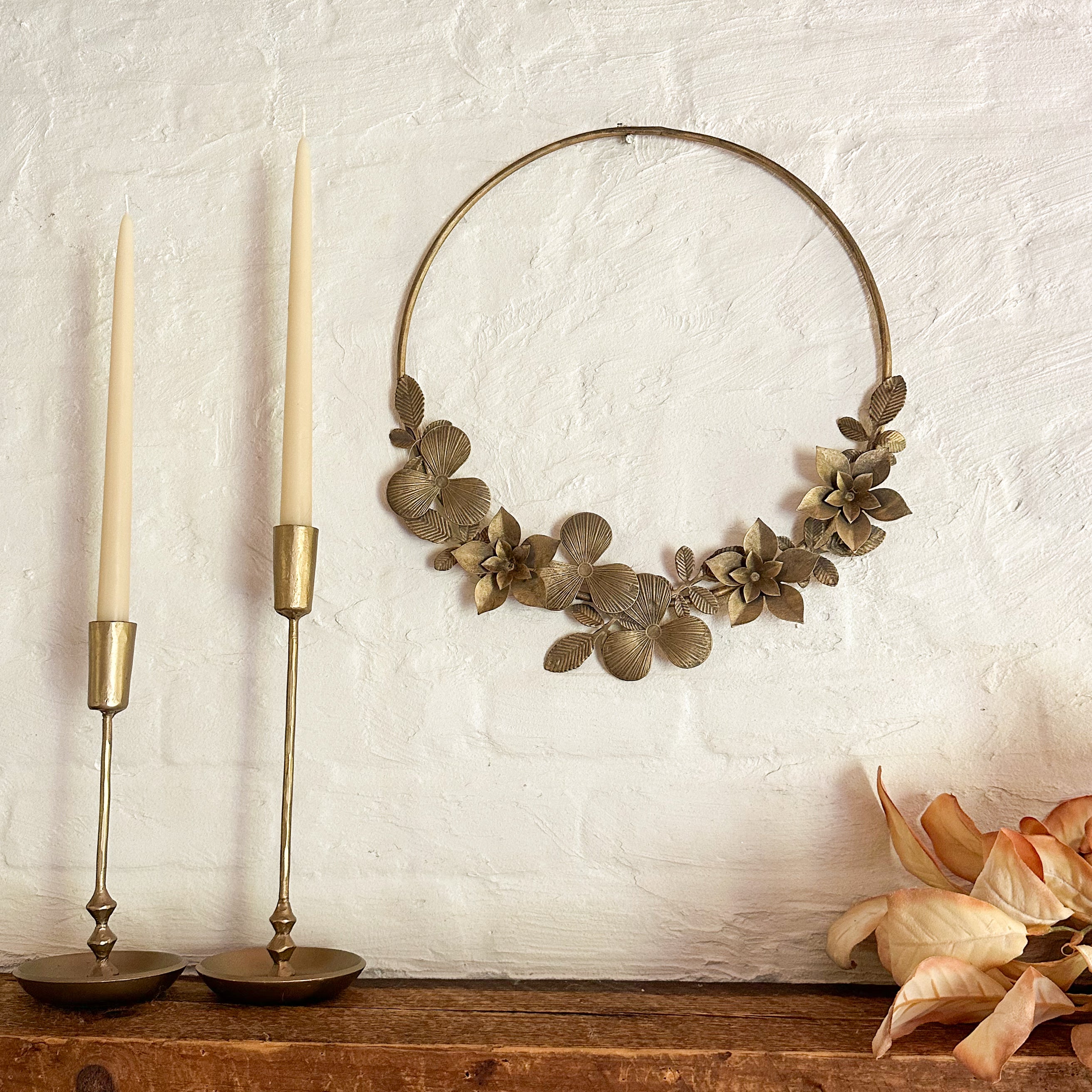 The Luna Brass Foliage Wreath showcases finely crafted iron and pressed metal flowers, offering a distinctive design suitable for all seasons. Its elegant structure brings a refined, timeless quality to any entryway or wall, elevating your décor with subtle sophistication throughout the year.