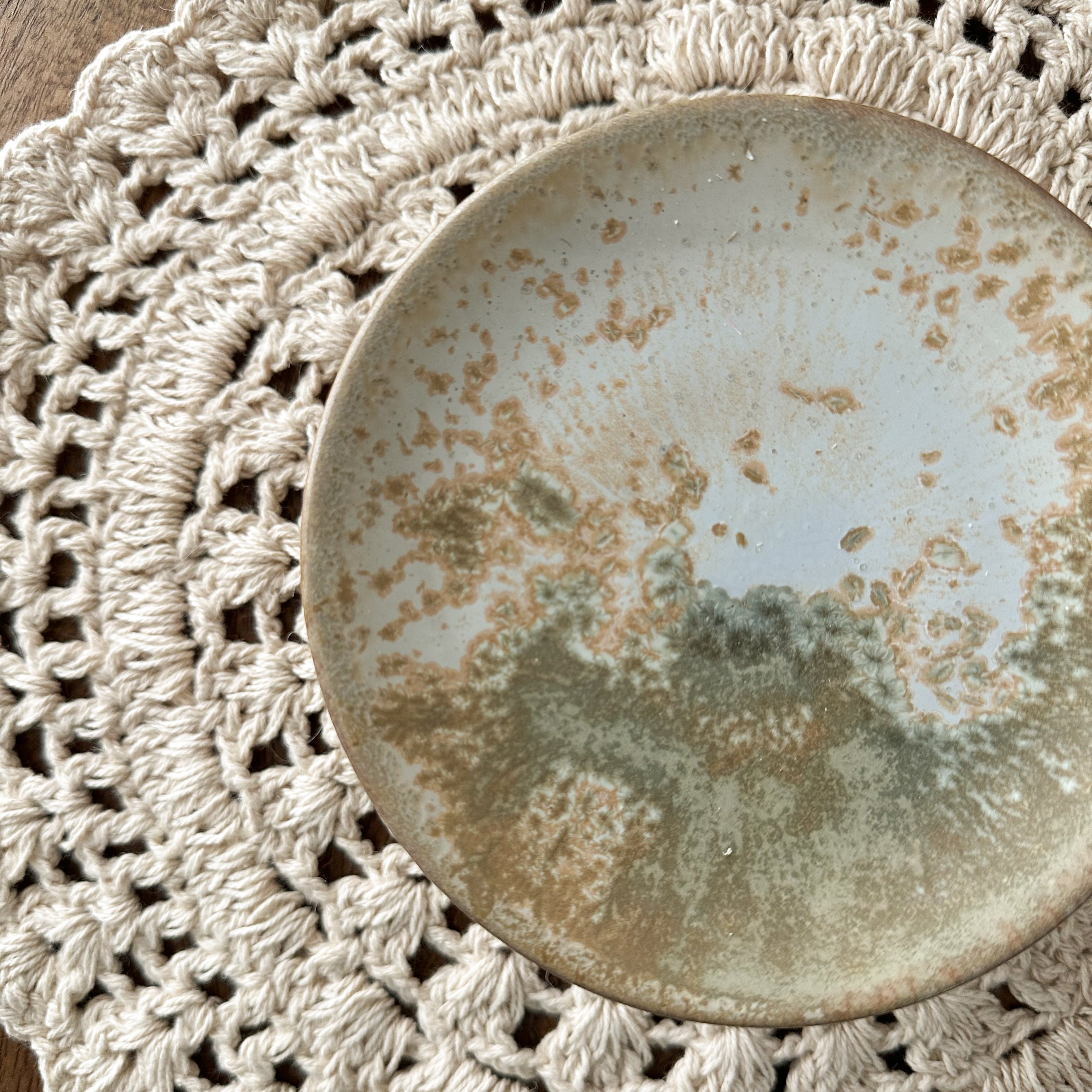 This petit ceramic pedestal features a warm mustard glaze on it's base and a fantastic reactive glaze on top. Each one will vary.
