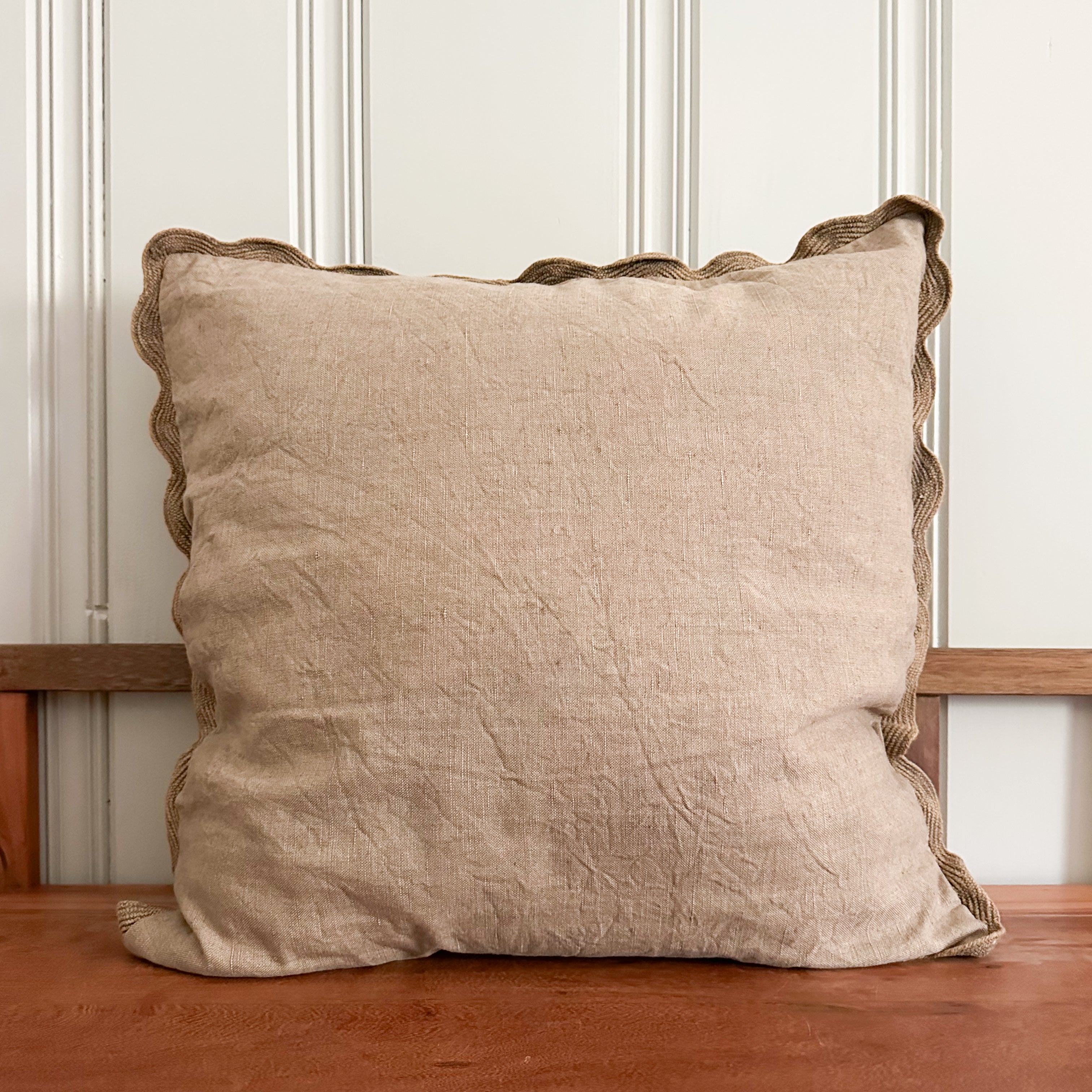 This Mink Scalloped Edge Linen Pillow brings simple elegance to any room with its refined scalloped edging and soft linen fabric. Its understated design adds a subtle touch of class, making it a versatile accent that complements a variety of décor styles with effortless charm.