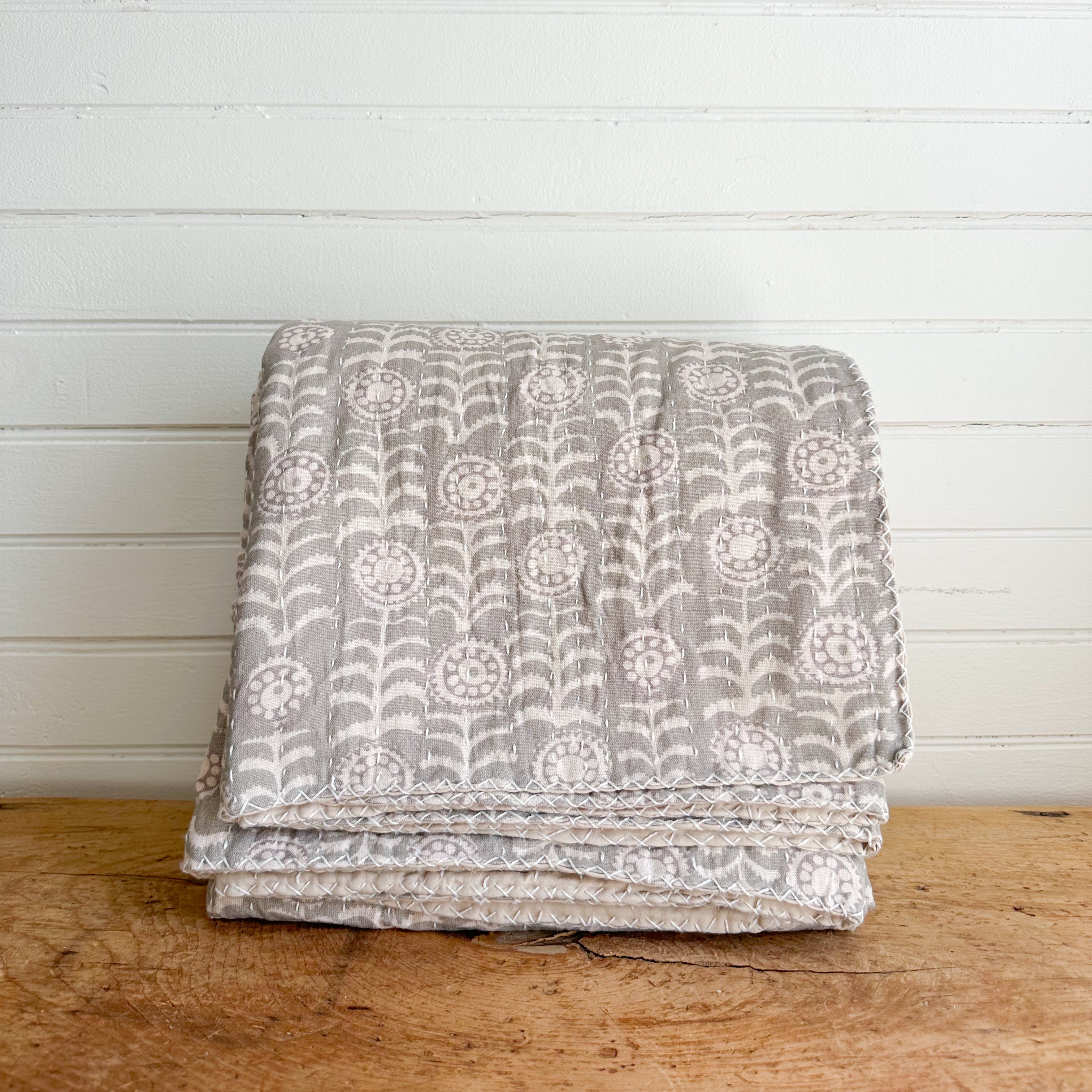 A Sagey Gray background, features an ivory floral block print on layers of hand kantha stitched cotton voile, the Sage Floral Bed Blanket brings a breath of fresh air to the bedroom. Generous in size, it beautifully drapes over a king or queen sized bed. Machine wash gentle.