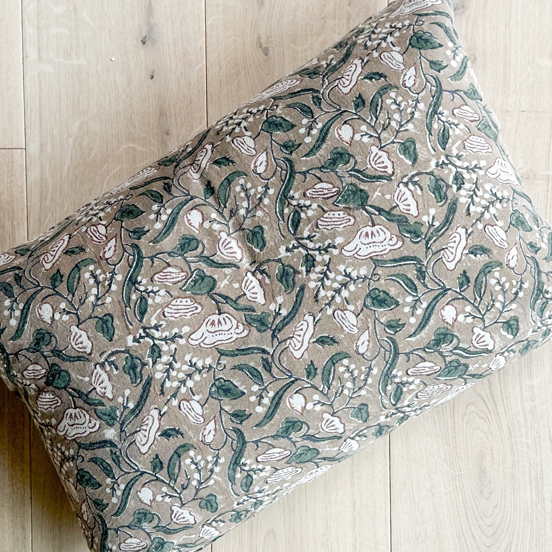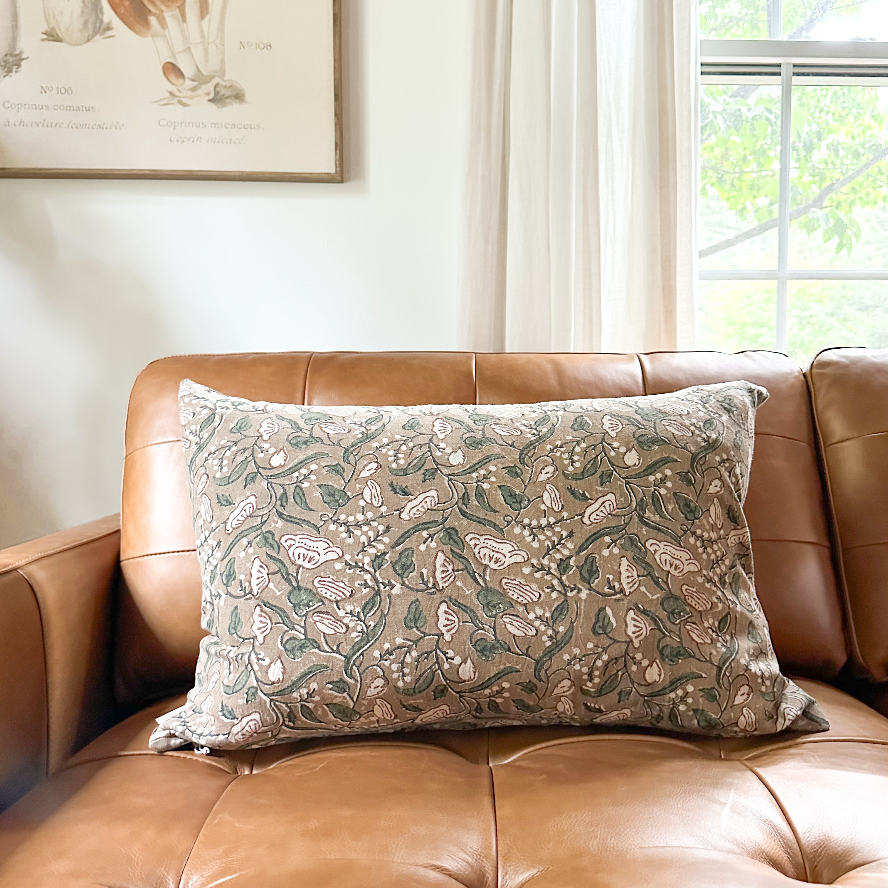 This pillow is the perfect accent for any room. Its unique batik rose pattern is hand printed on warm ochre linen, making it oh-so-pretty.