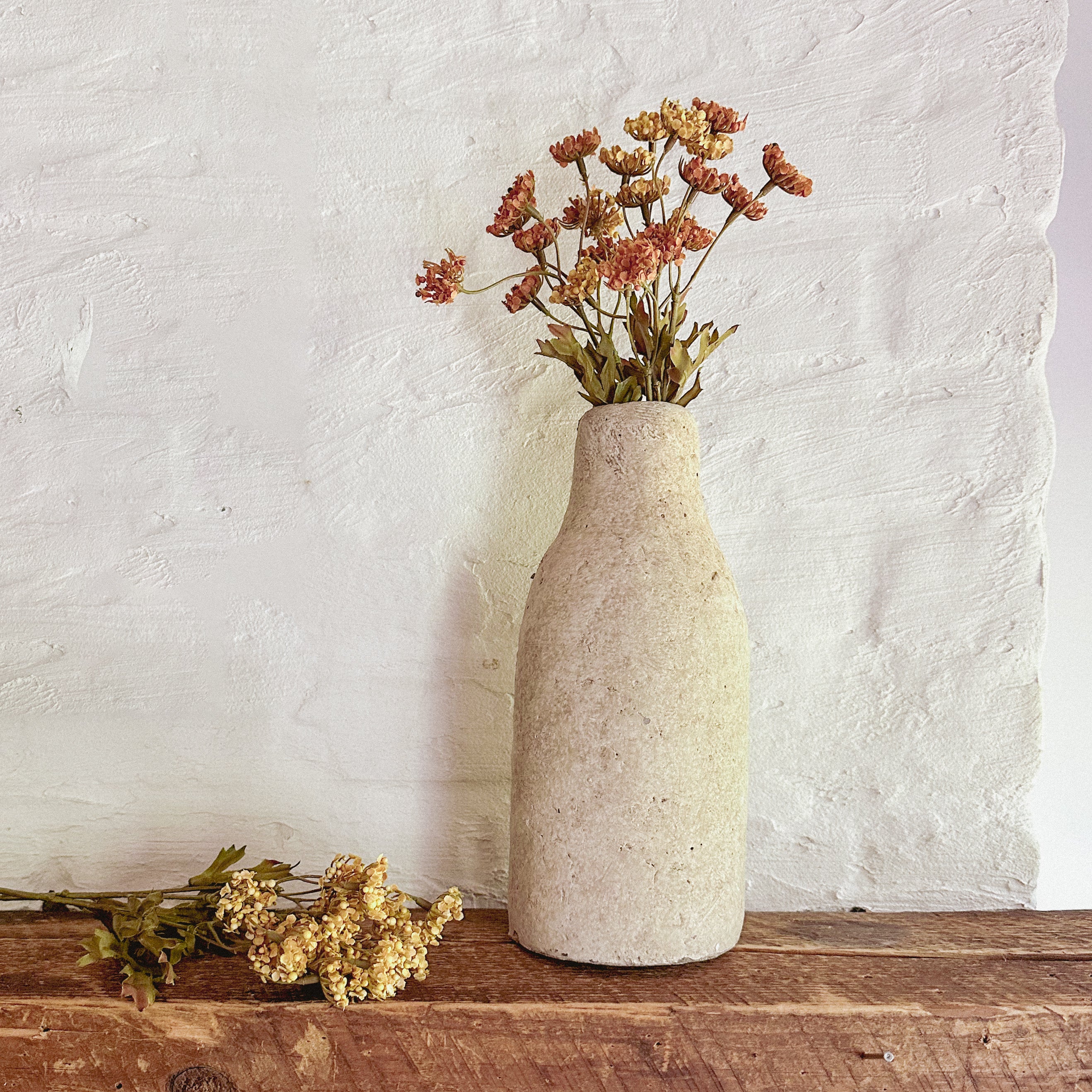 This Ancient Stone Vase is made of durable cement and features a tapered neck for a clean, modern look. Its sturdy design makes it ideal for holding faux flowers or standing alone as a simple decorative piece.