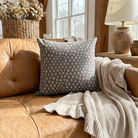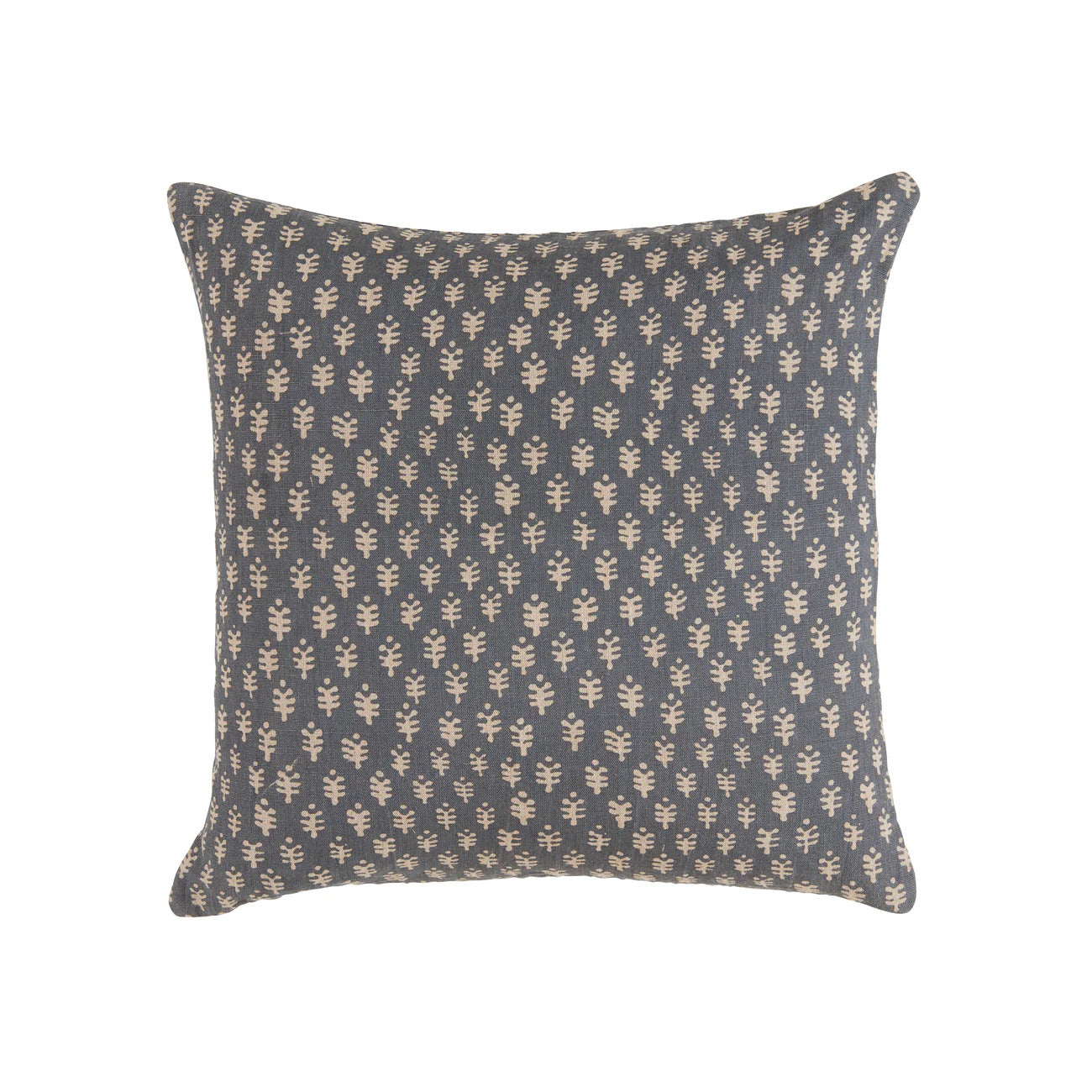 Soft gray-blue linen pillow handprinted by Indian artisans using traditional wood block methods. Nature-inspired design with charming variations in every piece. Includes luxury down insert.