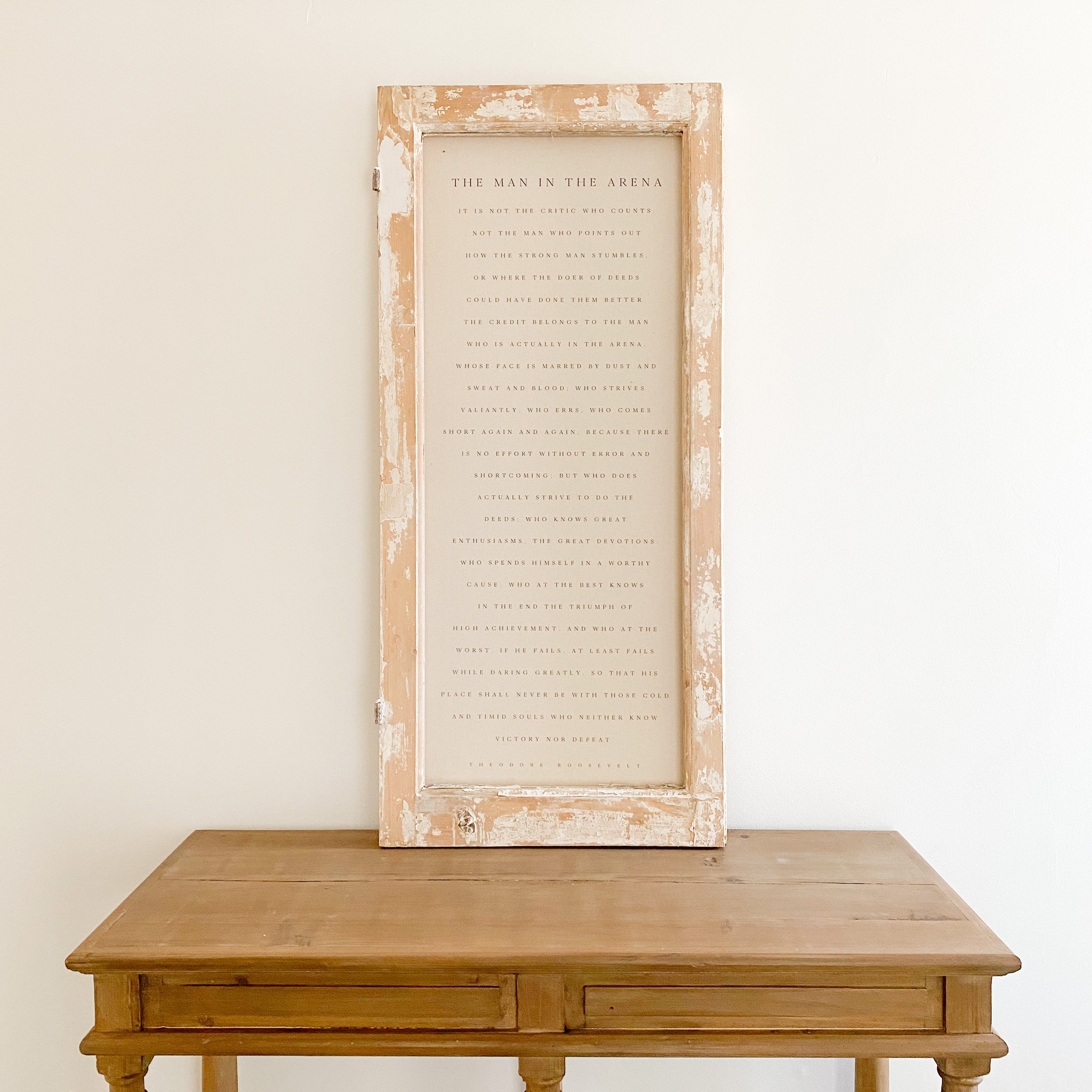 Each one of these vintage window frames is unique on it's own. With some leftover chippy paint of days gone by and a touch of hardware on each piece, it will add just the right amount of character to your home. Each saying is printed in charcoal on natural canvas.
