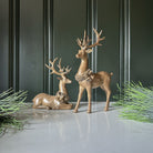 This charming resin deer features a pewter tone with beautiful antlers and a cozy scarf wrapped around its neck, adding a playful touch to any space.