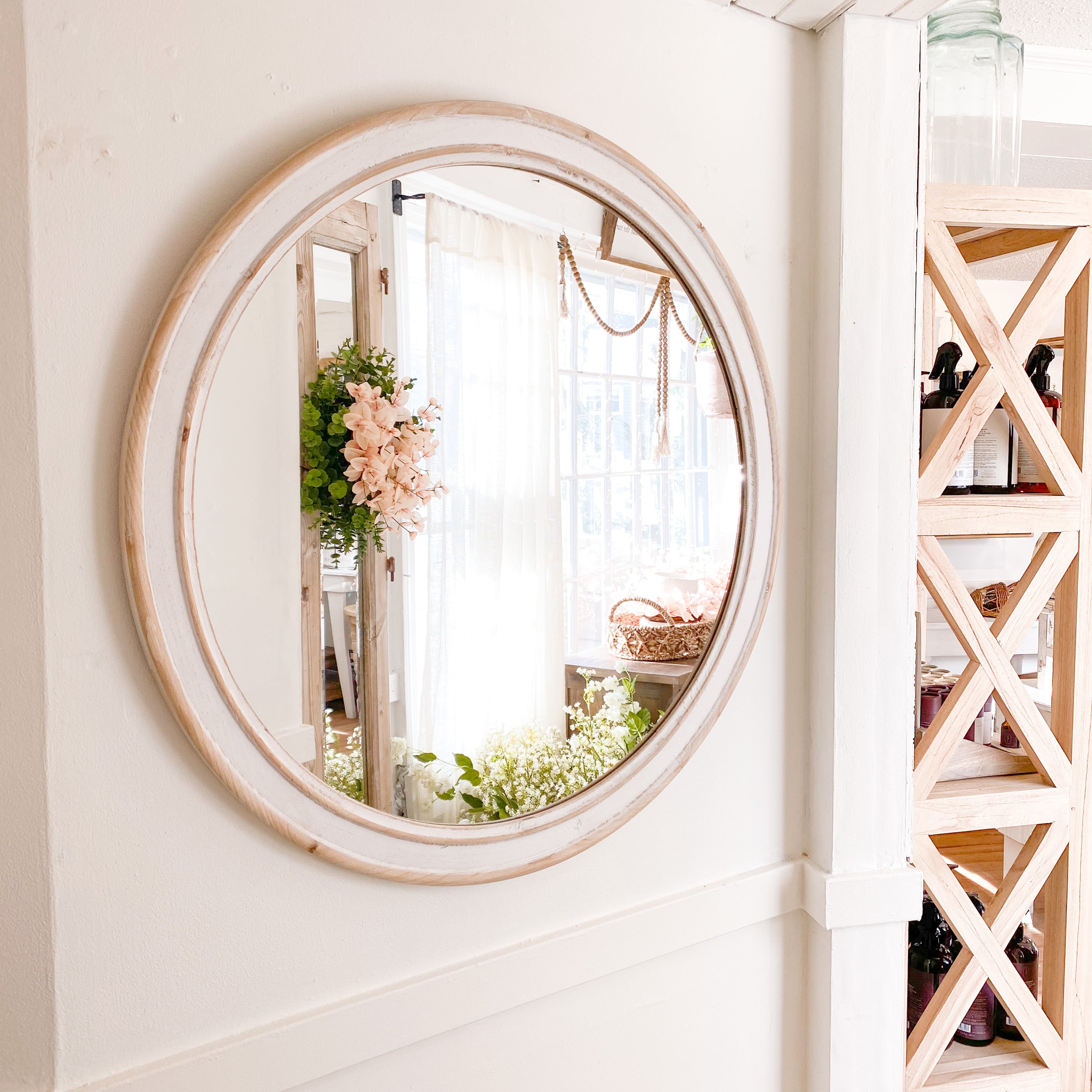 Reflecting on a wall space that could use something, but you're not feeling artwork for it? We love the distressed ivory shades on this round wall mirror. While it "reflects" a modern farmhouse style, it also goes well with a variety of aesthetics. Plus, it makes the room look larger!